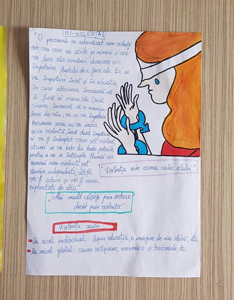 „Victoria obținută prin violență este echivalentul unei înfrângeri pentru că este temporară „(Mahatma Gandhi). Activitatea a fost realizată de elevii clasei a VIII-a, îndrumați de doamna profesoară Giurgiuman Teodora.