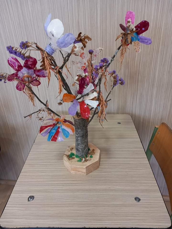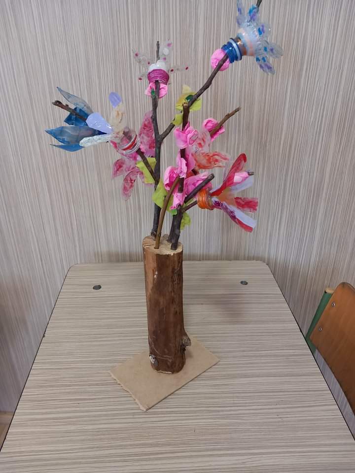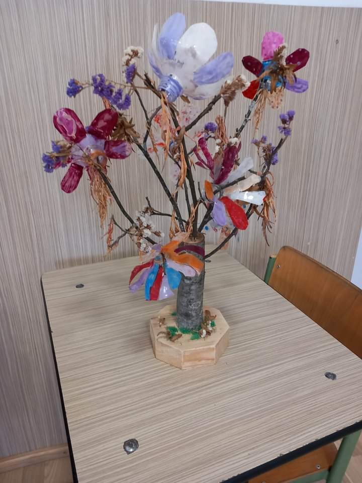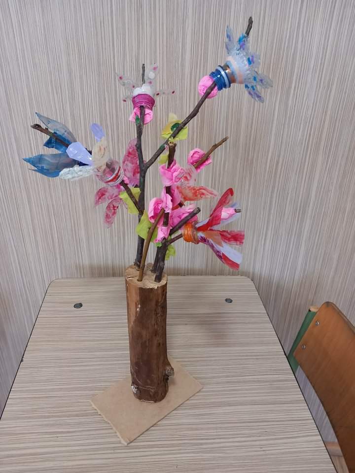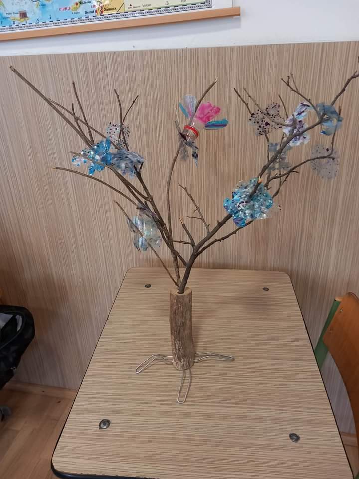 Copaci din materiale plastice, reciclabile realizate de elevii clasei a IV-A, de la Școala Gimnazială ,,Aurel Munteanu” – Valea Drăganului.