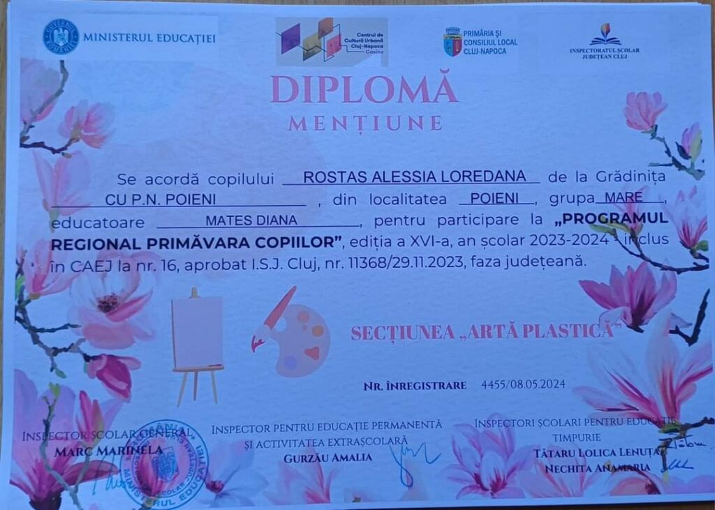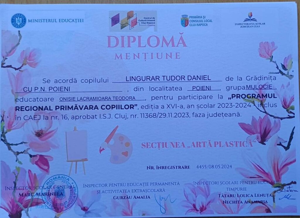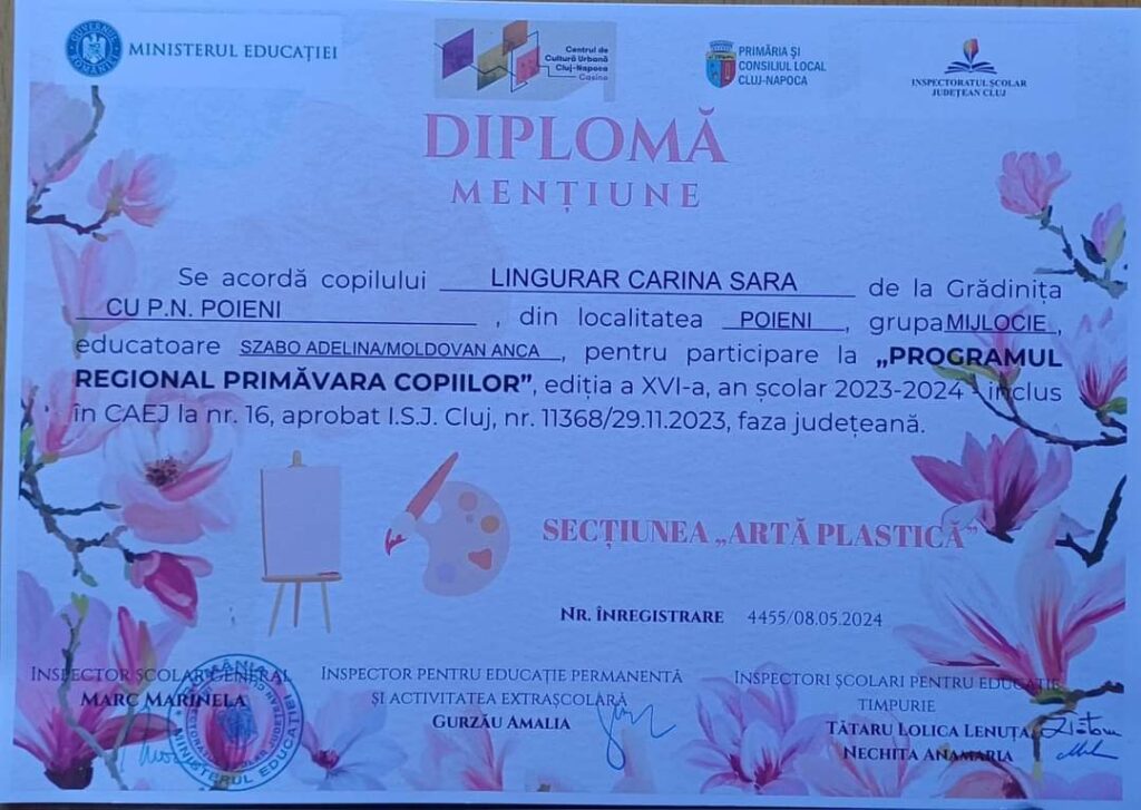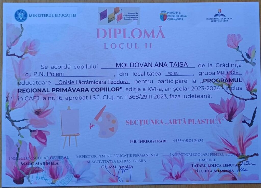 Copiii de la G.P.N. Poieni, coordonați de către doamnele educatoare Mateș Diana și Onisie Teodora, au participat la ,,Programul Regional Primăvara copiilor” și au obținut următoarele rezultate: