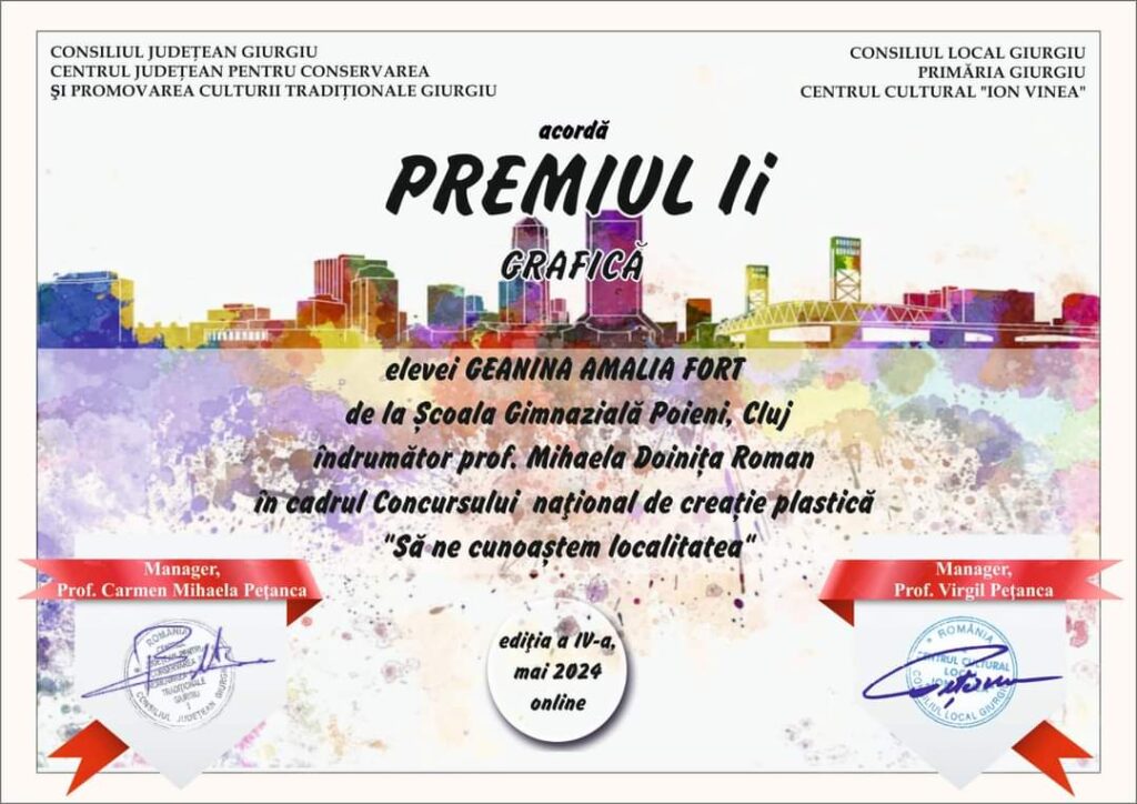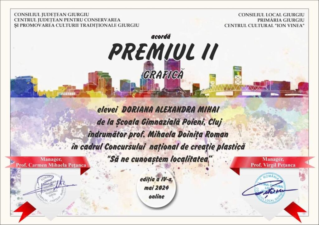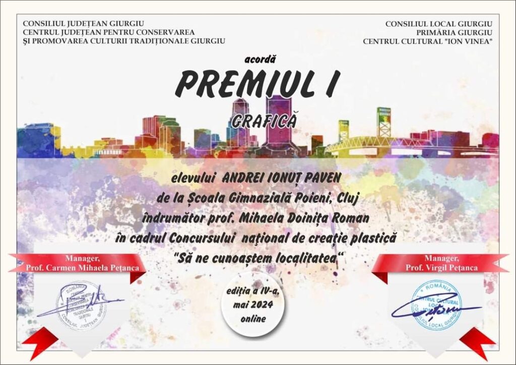 Elevii Școlii Gimnaziale Poieni au participat la Concursul Național de creație plastică: ,,Să ne cunoastem localitatea”, unde au obținut premii: Paven Andrei Ionuț – Premiul I, Paven Giulia Maria-Premiul II, Calo Gabriela – Premiul II, Morar Eliza Maria – Premiul II, Mihai Doriana Alexandra – Premiul II, Fort Geanina Amalia -Premiul II, Merca Roxana Andreea – Premiul II.
