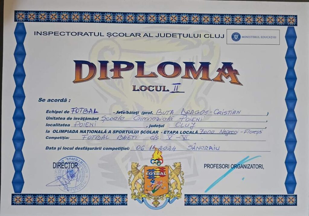 Echipa de fotbal a Școlii Gimnaziale Poieni cls. V-VI, a participat în data de 06.11.2024 la Olimpiada Națională a Sportului Școlar etapa locală zona Negreni-Florești organizată în Localitatea Sâncraiu, unde au obținut un rezultat demn de laudă, locul 2🥈⚽️!