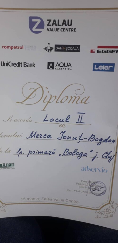 Elevul Merca Ionuț-Bogdan, din clasa a III-a, de la Școala Primară Bologa, a câștigat 5 partide și s-a clasat pe locul 2.