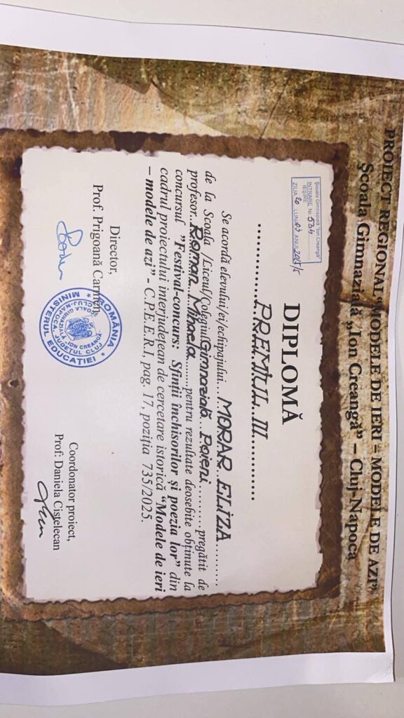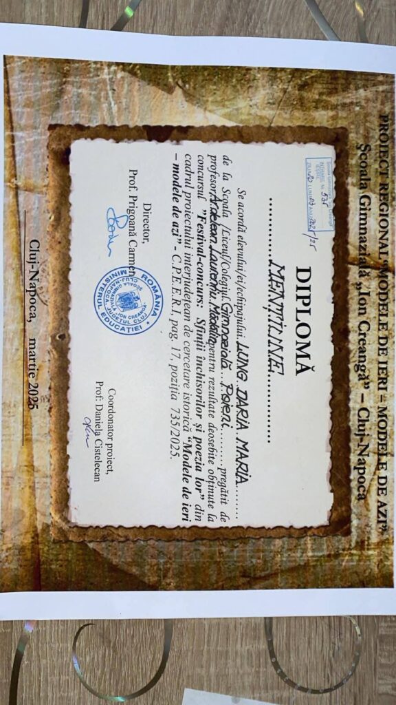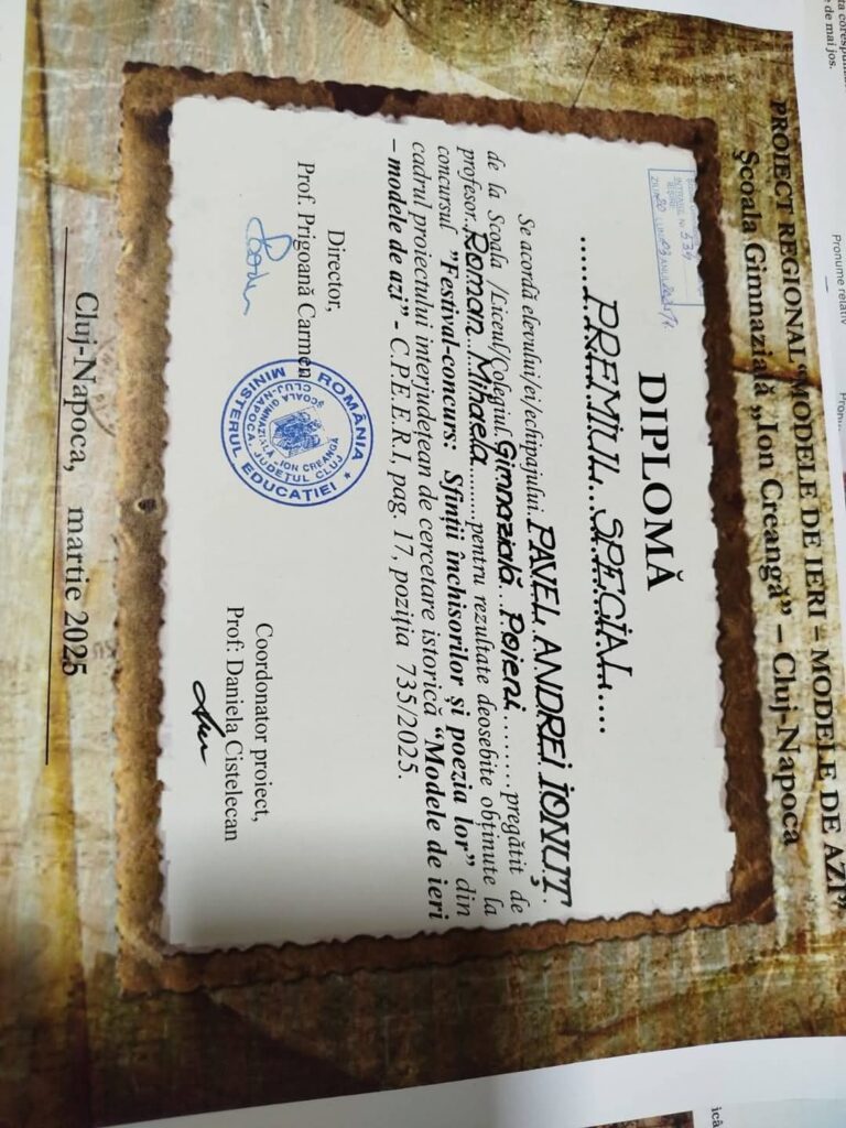Miercuri, 26 martie 2025, un echipaj de elevi de la Școala Gimnazială Poieni (Lung Daria Maria, Alb Adina Crina, Paven Andrei Ionuț, Morar Eliza Maria, Popa Sofia Paula și Panea Raluca Ioana) a reprezentat instituția la festivalul-concurs „Sfinții închisorilor și poezia lor”, din cadrul proiectului de cercetare istorică „Modele de ieri – modele de azi”, organizat de Școala Gimnazială „Ion Creangă” Cluj-Napoca, obținând următoarele premii:Lung Daria Maria (clasa a VI-a), mențiune, secțiunea recitare de poezie; Paven Andrei Ionuț (clasa a VII-a), premiu special, secțiunea desene și pictură; Morar Eliza Maria (clasa a VIII-a), premiul III, secțiunea desene și pictură. Elevii au fost coordonați de domnii profesori Roman Mihaela, Laze Corina, Ardelean Laurențiu și Morar Cornel. De asemenea, transmitem alese mulțumiri părinților care au făcut posibilă deplasarea elevilor la concurs.