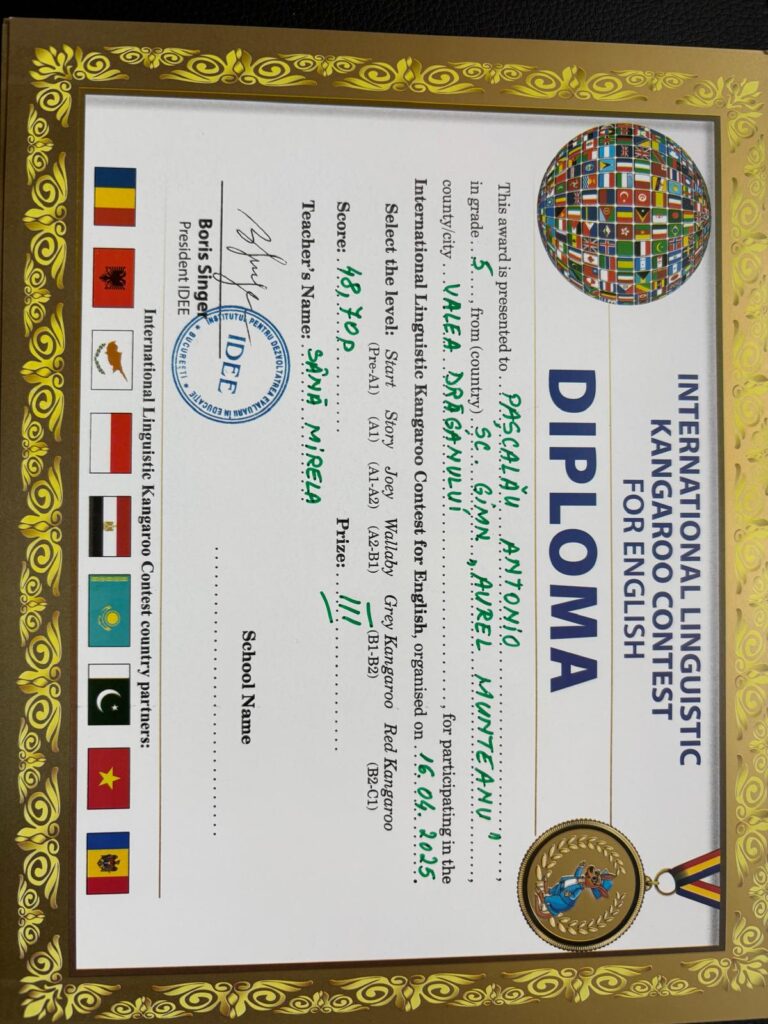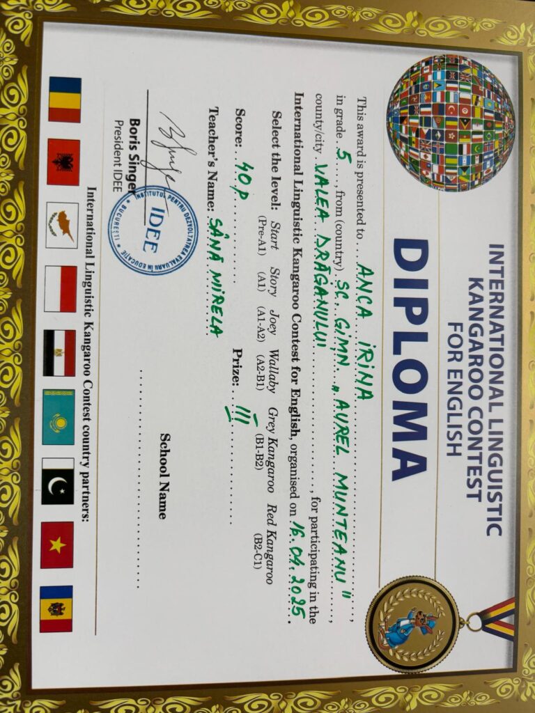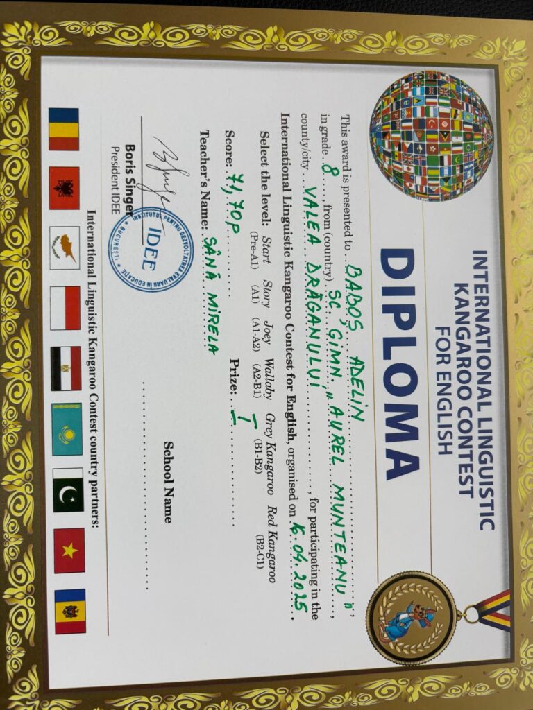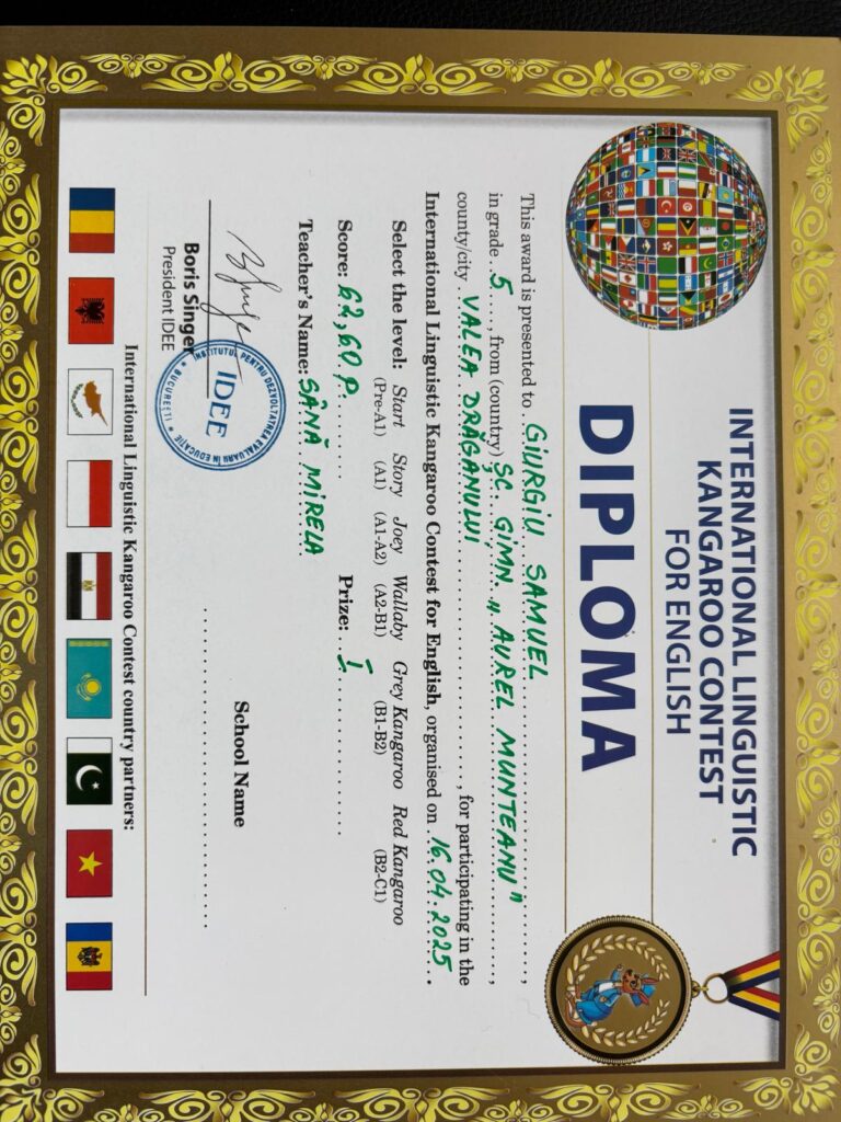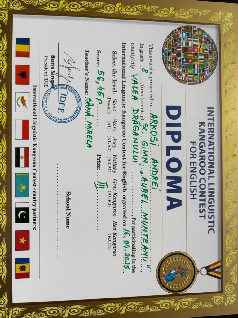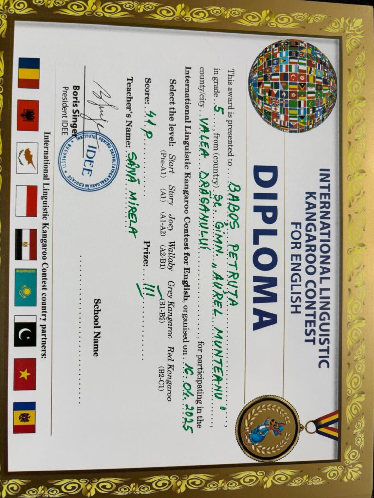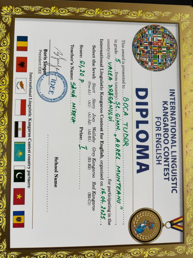 Pe data de 16 aprilie 2025, elevii Școlii Gimnaziale ,,Aurel Munteanu”, Valea Drăganului, coordonați de doamna profesor Sână Mirela, au participat la Concursul ,,Cangurul lingvist”-limba engleză, etapa a II-a.